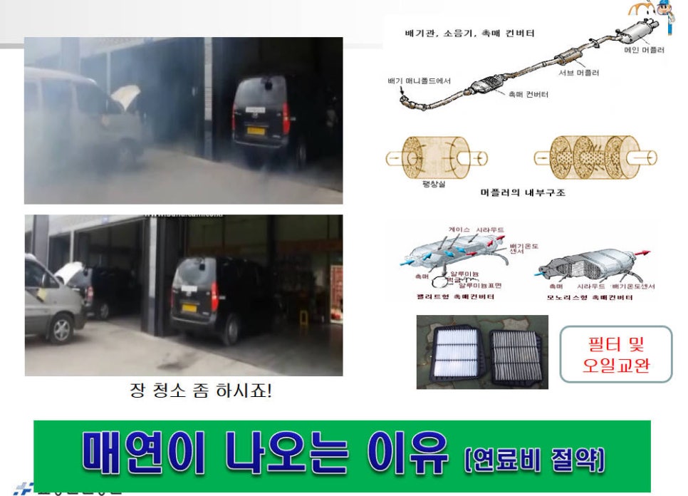 우측은 소음기의 구조인데 내부가 소음을 줄이기위한 구조가 매연을 쌓이게 하는 구조입니다