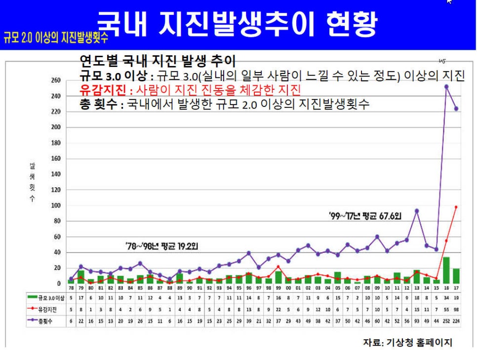 40년간 규모5.0이상 9회 중 최근 2년새 4회며 가장큰 지진 1, 2위발생