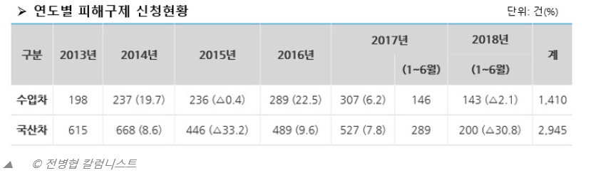 한국소비자원(원장 이희숙)에 따르면 최근 5년 6개월간(2013.1.∼2018.6.) 수입차 관련 피해구제 신청은 총 1,410건 접수됐고 하며, 동일기간 국산차 관련 피해구제 신청은 총 2,945건 이라한다.