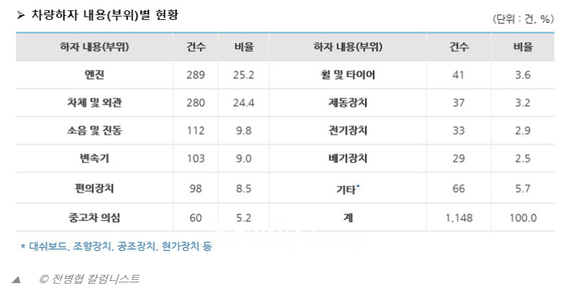 차량하자의 구체적 내용(부위)을 보면, ‘엔진’이 25.2%(289건)로 가장 많았고, ‘차체 및 외관’ 24.4%(280건), ‘소음 및 진동’ 9.8%(112건), ‘변속기’ 9.0%(103건), ‘편의장치’ 8.5%(98건) 등이었다.