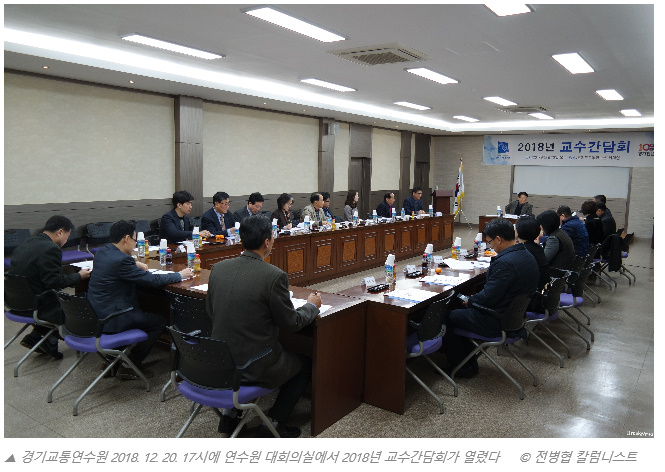 정부는 국가 교통안전을 체계적으로 관리하기 위해 교통안전에 관한 중장기 종합계획(5년 단위)을 수립하여 시행하고 있다. 현재 제8차 국가교통안전기본계획(2017~2021)이 추진 중이며 이 안에 따르면 교통사고 사망자를 2,700명을 줄이는 것인데 지난 7월 6일 놀랍게도 사망자를 대폭 하향한 2,443명으로 종합기본 계획을 변경한 바 있다. 그동안 7차 기본계획 설정과 실시 결과에서 교통사고 사망자의 계획대비 실적은 터무니없는 계획에 불과 했고 지난 제8차 기본계획 변경도 허구의 과장에 불가한 것쯤으로 생각했다. 그런데 지난 7일 국토교통부의 보도 자료에 따르면 2018년 11월까지 교통사고 사망자가 10.1% 감소한 3,443명으로 발표되어 또 한번 충격적 발표며, 이에 정책의 성공을 확인할 수 있는 계기를 보고 있다. 이는 더욱 강력한 정부의 실천의지가 담겨있는 제8차 중장기 교통안전기본계획이며 실천가능성에 긍정적 생각이 들게 한다. 지난 20일 경기도교통연수원(원장 김길섭)은 2018년 교수간담회를 연수원 회의실에서 연수원 전임강사 25인, 연수원관계자 11인 함께 2018년 연수원 업무 추진결과를 공유하며 2019년 교육운영계획을 발표했다. 김길섭 원장은 인사말에서 2018년 연수원의 교육목표를 달성하였고 열심히 해준 직원들의 노고를 치하 하였으며, 이어 목표달성의 중심에는 연수원을 아끼며 경영철학을 공유하며 고객만족을 높여주는 교수들의 노고를 치하했다. 교수님들은 개개인의 역량이 출중하여 연수원이 설립취지와 경역목표에 기여한 성과가 실적으로 나타났다고 하며 2019년에도 변화와 혁신으로 운수종사자의 안전을 위한 더 큰 열정으로 노력해 줄 것을 당부했다.
