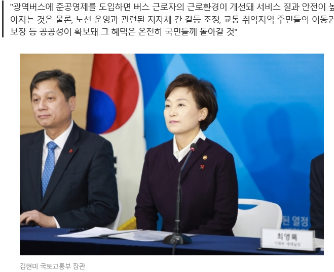 김 장관은 "광역버스에 준공영제를 도입하면 버스 근로자의 근로환경이 개선돼 서비스 질과 안전이 높아지는 것은 물론, 노선 운영과 관련된 지자체 간 갈등 조정, 교통 취약지역 주민들의 이동권 보장 등 공공성이 확보돼 그 혜택은 온전히 국민들께 돌아갈 것"이라고 말했다.