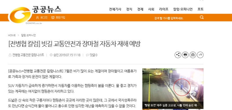 제목 [전병협칼럼]빗길 교통안전과 장마철 자동차재해예방(2019.7.15공공뉴스) 조회수 286