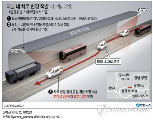 도로공사가 창원1터널 양방향에 2대씩 설치한 CCTV는 자동차 번호판을 식별해 터널 내 차로 변경 금지 규정을 위반한 차량을 자동으로 잡아낸다. 지난 한 달간 계도기간을 거친 뒤 지난 21일부터 본격 운영했다.