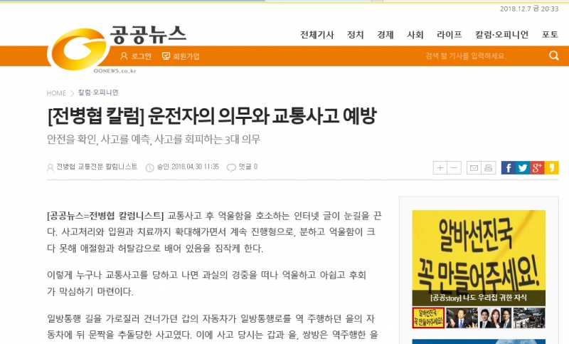 [전병협 칼럼] 운전자의 의무와 교통사고 예방 공공뉴스/네이버, 다음 뉴스보도