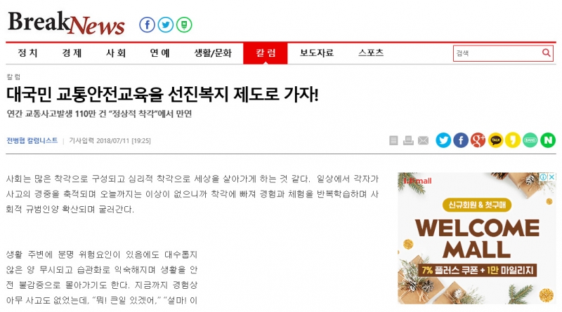 대국민 교통안전교육을 선진복지 제도로 가자! 연간 교통사고발생 110만 건 “정상적 착각”에서 만연 사회는 많은 착각으로 구성되고 심리적 착각으로 세상을 살아가게 하는 것 같다. 일상에서 각자가 사고의 경중을 축적되며 오늘까지는 이상이 없으니까 착각에 빠져 경험과 체험을 반복학습하며 사회적 규범인양 확산되며 굴러간다. 생활 주변에 분명 위험요인이 있음에도 대수롭지 않은 양 무시되고 습관화로 익숙해지며 생활을 안전 불감증으로 몰아가기도 한다. 지금까지 경험상 아무 사고도 없었는데, “뭐! 큰일 있겠어,” “설마! 이 정도는 괜찮아” 하며 자기 경험에 따른 착각을 믿어버리는데 이를 “정상적 착각”이라 한다. 안전 불감증은 정상적 착각 2011. 3. 11 “동일본대지진 쓰나미”재해 때에 1만7천여 사망자가 발생했다고 한다. 그해 8월말 뉴스자료에 따르면 검사가 끝난 1만4,553명 중 신원이 밝혀진 사람의 절반이 넘는 55.7%가 65세 이상의 고령자 이었다고 한다. 피신에 다소 부정적이었던 노인층에서 사망자 피해가 가장 많았던 것도 생활에서 경험해온 “정상적 착각” 때문일 것이다. 평생을 살아오면서 많은 태풍과 지진을 겪으면서 대피를 경험했지만 과잉대응 이었다는 “정상적 착각”이 팽배했기 때문에 상상을 초월하는 자연재해를 믿을 수 없었기 때문이다. 긴 장마와 30여분 간격으로 앞이 안보일 정도의 국지성 폭우에도 시내를 운전하는 많은 자동차가 전조등이 켜져 있지 않은 것을 지난장마 때면 관찰되곤 하는 사안이다. 아직 빗속에서 위험을 경험하지 못한 “정상적 착각”이란 생각이다. 교차로 4거리에서 횡단보도에 서있는 보행자는 차량신호등을 바라보고, 신호대기 운전자는 보행신호를 보고 있는 웃고만 넘길 수 없는 이 사회의 진풍경이다. 어린이들 까지도 교차로 자동차신호등이 황색신호가 바뀔 때를 기다린다. 보행신호가 파랑으로 바뀌기 전에 차도로 빨리 뛰어 건너기 위해서다. 통과 자동차도 황색신호로 바뀌는 것을 보면서 교차로를 통과하려고 더욱 가속을 한다. 또한 신호대기에서 나란히 정차한 자동차는 좌측 1, 2차선보다 3차선에서 급히 속도를 내며 출발하려다 1, 2차선 자동차에 시야가 가려져 황색신호에 꼬리 물고 과속하는 자동차에 대형 사고를 당한다. 보행자도 보행신호에 성급하면 황색 꼬리를 문 신호위반차에 사고를 당하는데, 교차로 사고의 대부분이다. 보행자나 운전자가 3초의 황색신호 기간을 참아내기 힘든 심리는 정상적 착각 현상에서 발생한다. 교통안전 법정 의무교육 시스템화 확대로 해결 연간 총110만 여건의 교통사고와 약 180만 명이 부상당하고 4천2백 명 이상 사망하면서도 우리는 급하고 분주하며, 나와는 관계없는 것으로 착각하고 살아간다. 잘 나가던 집이 풍비박산에 극빈층으로 떨어지는 것이 교통사고 후유증임을 생활주변을 한번 돌아보면 쉽게 알게 된다. 도로상에서 일어나는 많은 실수의 시행착오에서 경험을 교통안전교육을 통하여 일깨워주는 일을 정책으로 사회복지로 풀어나가야 한다. 가수는 1천 번을 듣고 1천 번을 부르면서 자기 노래를 완성한다고 한다. 교육의 효과를 행동으로 옮기기 위해서는 400여회 반복된 교육과 반복된 행동을 실천해야 무의식에서도 행동으로 변한다고 한다. 교통사고 사망자는 4년 전에 5,000여명 대에서 분명 줄어들었다. 블랙박스 시대와 국토교통부의 자동차의 강도 기준 강화와 첨단 안전장치 도입으로 인해 줄어드는 요인이 크다는 분석이다. 그리고 맨인불랙박스, 불랙박스로 본세상 등 언론이 기여를 많이 하고, 난폭 보복운전 등 국민의 자발적 공익신고에 위험 운전이 개선되고 있는 실정이라 생각된다. 블랙박스 시대를 맞아 세계 각국이 교통사고 사망자는 동일한 비율로 줄어드는 것이 현실이라고 생각된다. 문제는 정책을 잘 펴서 교통사고가 줄어드는 것인가 하는 문제다. 궁여지책으로 시내 도로를 시속60km에서 50km로 줄인다. 전문가 입장으로 그것 참이다. 선 과제를 생각해봐야지 연구과제 수행과 정책변화 생색과 고령자 규제가 앞서는 것 같아 왜 먼저해야할 정책은 등한시할까 의문이다. 어린이 보호구역이나 고령자 보호구역에 과속단속 카메라가 100% 시설하고, 교통안전교육을 선진복지 정책의 일환으로 직장인들은 의무교육, 고령자는 기초연금과 연동한 의무 생활교육, 어린이, 중고교 교통안전 교육을 체계화 시키고, 주민교육을 위한 학교의 교실을 주민 교육장으로 활용하여 교통안전을 학습하고 생활화 하는 정책을 펴야 할 것이다. 교통사고는 안전 불감증에 의한 “정상적 착각”이 원인한다. 교통안전 교육도 선진화 복지제도라고 생각한다. 교통안전 교육이 생활주변에서 반복적으로 시스템화 되면 “정상적 착각”의 불감증이 선진교통문화로 치유될 수 있을 것이라는 생각을 한다. *전병협.교통교육복지연구원 대표/교통안전교육 전문가/칼럼리스트/수필가/월드그린환경연합중앙회 부회장.
