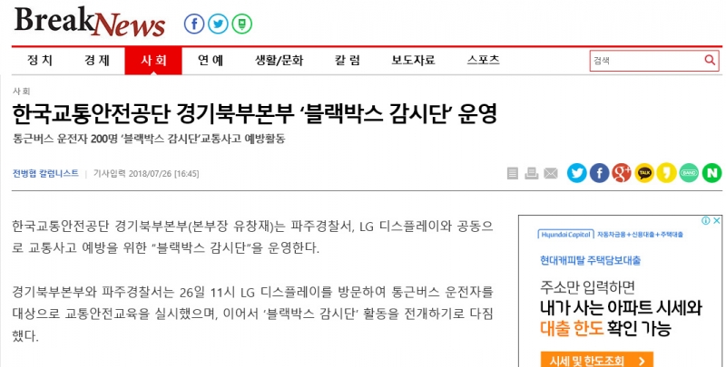 아울러, 참여 차량은 후면에 『블랙박스 감시단』스티커를 부착하며, 운행 중 범법행위 촬영 내용을 경찰청 ‘스마트 국민제보 앱’을 통해 자발적으로 제보하게 된다. 한국교통안전공단 경기북부본부 유창재 본부장은 ‘감시단’은 참여자들(블랙박스 감시단)로 하여금 자발적인 교통법규 준수율을 더욱 높일 수 있으며, 난폭운전과 얌체운전을 예방하고 교통사고를 줄이는 선진교통문화로 바꾸는데 맡은바 소임을 다할 것을 강조했다. 또한 파주경찰서와, LG 디스플레이, 운수회사가 적극적으로 협력하는 만큼 교통사고 감소를 위해 시민들의 높은 참여와 관심을 당부했다. |