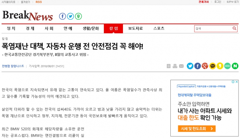 폭염재난 대책, 자동차 운행 전 안전점검 꼭 해야!- 한국교통안전공단 경기북부본부, 8월의 교통사고 위험 - 전국이 폭염으로 지속되면서 유래 없는 고통이 연속되고 있다. 올 여름은 폭염일수가 관측사상 최고 일수를 기록할 가능성이 이미 예견되고 있다. 살인적 더위라 할 수 있는 전국이 섭씨40도 가까이 오르고 밤과 낮을 가리지 않고 숨막히는 더위는 폭염 재난으로 인식하고 정부, 지자제, 전문기관 등이 국민보호에 발빠르게 움직이고 있다. 최근 BMW 520의 화재로 해당차량을 소유한 운전자는 공포스럽다. BMW는 엔진결함으로 리콜이 실시되지만, 최근 3년간 자동차의 화재는 1,371건이나 된다는 서울소방재난본부의 발표도 있었다. 많은 차량의 화재는 전기적, 기계적, 차량사고에 의해 발생되며, 여름철 폭염은 모든 화재사고 가능성의 원인이 되고 있다. 8월의 계절적 특성은 교통사고와 상당한 인과관계가 있다고 생각되며 8월의 교통사고 추세를 알아보고자 한다. 한국교통안전공단 경기북부본부(본부장 유창재)가 발표한 통계를 보면, 최근 5년(2013년~2017년)간 경찰청·보험사 통합 교통사고 현황 비교 결과 혹서기 및 휴가철 이전(1월~7월) 대비 8월교통사고 건수 및 사망자가 모두 증가한 것으로 나타나 이에 대한 대책이 필요하다고 했다. ▲ 최근5년간 월별교통사고 통계(2013~2017년/교통안전공단) © 전병협 칼럼니스트 |