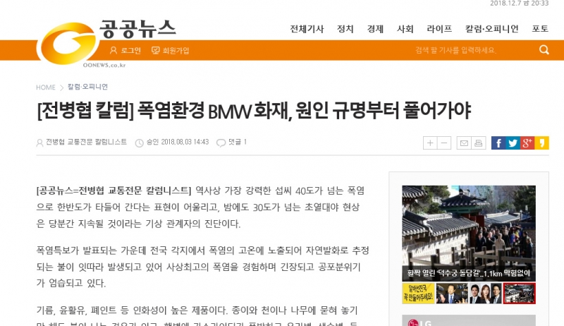 [전병협 칼럼] 폭염환경 BMW화재, 원인규명부터 풀어가야/네이버 다음 2018.08.03