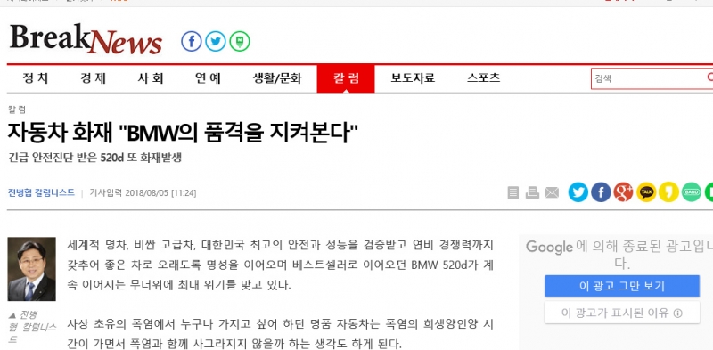 필자가 칼럼을 쓰는 이시간도 화재뉴스가 또 들어오고 있다. 어제(4일) 2시 15분 목포에서 불이난 BMW 520d는 “긴급 안전진단을 받은 것”으로 경찰이 밝혔다는 뉴스이고 보면 BMW는 “도요타 급발진 대응과 무슨 차이가 있을까!” 한 번 더 확인시켜준다.