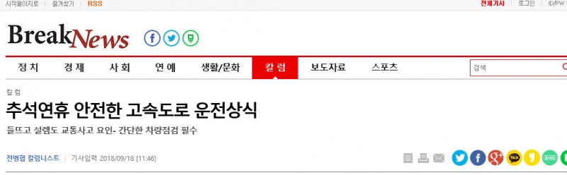 추석연휴 안전한 고속도로 운전상식들뜨고 설렘도 교통사고 요인- 간단한 차량점검 필수 이번 추석 명절도 5일간 연휴이다. 지난 사례로 보아 100만여 명 가까이 해외여행이고, 국내서 고향을 찾는 사람들 대분은 가족과의 고속도로 여행이 될 것이라는 예상이다. 과거에 비하면 고속도로의 과잉정체 구간은 많이 개선되어 속도가 빨라졌지만 그래도 일정에 따라, 시간에 따라서 원활한 소통구간도 있고 장시간 정체구간도 피할 수 없다. 명절은 모처럼 가족과 함께 고향 나들이 길이라 운전자도 탑승자도 들뜨고 벅찬 감정은 마음이 설렌 탓에 자연히 빨리 가길 바라는 심리적 현상에서 차분하지 못한 행동특성이 있을 수 있다. 차가 밀리는 구간에서 장시간 정체 후에 길이 트이면 보상심리에 의한 순간적인 과속운전이 되며, 이 원인이 빌미가 되어 크고 작은 교통사고가 발생하는 현상이 있다. 밀리는 구간에서의 보상심리는 잠시 동안에 방어운전 의무를 쉽게 망각하기 때문이다. 귀향 귀경길 가장 염려되는 것은 피로한 상태에서 운전하다보면 졸음운전의 위험에 빠진다. 무리한 일정에 과로하지 않고 이동일정을 생각해 이동 전날에 과음이나, 과로한 놀이를 자제함이 상식이다. 졸음이 올 때면 의도적으로 과속하면서 긴장된 운전, 뺨을 때리고, 코나 귀를 후비고, 꼬집고, 음악을 크게 틀고, 노래를 부르거나 껌을 씹고 이런 행동을 하는데 모두 일시적이다. 반드시 가족의 안전을 위해서 안전한 장소에서 정차를 하고 20~30분 이상의 시간동안 실제 잠을 잔 후에 스트레칭과 커피를 마시며 잠을 쫒는데 뇌에 이미 입력된 잠자라는 메모리는 실천을 해야 지워지는 것이다. 많은 사람들이 졸음운전이라 함을 잠이 들어 스스로 의식이 없는 상태를 생각할 수 있다. 그러나 졸음운전은 의식이 몽롱하여 하품이 계속되고 눈꺼풀이 무거워지고 졸음이 쏟아져 올 때 이미 졸음운전을 한 것으로 생각해야 한다. 시속 100km를 달리는 자동차는 1초에 28m를 질주한다. 2초의 몽롱한 깜박 졸음은 치명적 결과를 가져옴이 상식이다. 55m를 무의식으로 질주 하게 되는 것이다. 자동차의 구조적 특성으로 조향 행들의 직진성이나 복원력이 작용하니까 다행이지 자동차의 그런 역학적인 작용이 없다면 아찔한 상상을 하게 된다. 즉 졸음이 찾아 왔을 때는 이미 졸음운전이니 그전에 예방해야 한다. 고속도로는 운행 중 자동차가 고장을 일으킨 다면 모든 운전자는 당혹해하고 당황하게 되어 대형사고의 원인을 유발할 수 있다. 이때는 침착하게 비상점멸등을 켜고 갓길로 진입해 도로우측 가장자리에 바싹 붙여 정차한다. 갓길에 정지 후는 승차자를 신속하게 도로 방호벽 넘어 안전한 곳으로 피신시킨다. 후방에 고장차량 삼각표지판을 후미차가 잘 보이도록 설치해야 한다. 야간에는 충분한 거리에서 식별할 수 있는 섬광 신호를 설치해야 하며, 차량의 비상 점멸등을 켜서 고장 차량임을 우선 알려야 한다. 이같이 안전조치를 끝낸 후는 차량 고장부위를 점검해야 한다. 고장부위 점검결과 응급조치가 불가능할 경우에는 도로공사나 고속도로 순찰 차량에게 알려 지원요청을 받는다. 일반도로와는 달리 고속도로는 차량의 결함은 곧바로 사고와 연결된다는 점에 신경을 써야할 것이며 이로 인한 2차 사고는 대형사고임을 상기해야 한다. 타이어의 공기압 부족이나 이상마모 등 타이어 불량은 타이어가 파열되면 중앙선침범, 차선이탈, 차체전복사고 등 대형교통사고를 유발할 수 있다. 타이어 점검은 빼놓지 말고 철저히 해야 한다. 고속도로 정비불량 사고의 70%가 타이어관련 사고며 대부분 공기압 부족에 원인한다. 차체의 중량에 의해 지면접촉 부위가 눌려 있는데 분당 수 백회의 바퀴회전이 되풀이되면서 타이어는 옆 부분의 고열(스탠딩웨이브현상)로 피로하여지고 고열은 순간 파열사고로 발생된다. 그러므로 고속도로 주행 시에는 공기압을 15 ~ 20%정도 평소보다 높여야 차량중량에 버티고 스탠딩웨이브 현상을 예방하고 연비향상으로 연료절감도 할 수 있다. 안전한 귀향과 귀경위한 준수사항 그러므로 안전한 귀향귀경 운전을 위해서 몇 가지 준수사항을 제시한다. 첫째, 가다서다 반복되는 구간에서 순간과속 등, 급하고 설레는 감정자제 한다. 둘째, 출발 전에 엔진오일, 냉각수, 타이어공기압 표준보다 15~20% 더 주입하고 안전삼각대와 불꽃신호기 등을 점검한다. 셋째, 귀향, 귀경안전을 위한 과음이나 과로를 피하고 운전 중에는 졸음이 진행초기에 짧은 잠이라도 자야 한다. 또한 유체자극현상이란 고속으로 주행하게 되면 노면과 좌. 우에 있는 나무나 중앙분리대의 풍경이 마치 물이 흐르듯이 흘러서 눈에 들어오면 느낌을 말한다. 이러한 자극은 오랜 시간을 운전하게 되면서 운전자의 눈의 몹시 피로하게 되며 점차 시계의 입체감을 잃게 되고 속도감, 거리감등이 마비되어 점점 의식이 저하되며 반응도 둔해지게 된다. 고속도로 운전자에 대한 연구 결과에 의하면 주행 시작 후 약 90분에서 가장 지루하고 피곤하다고 한다. 연속 운전으로 200㎞를 초과하는 운전은 안전에 영향을 미친다. 그래서 2시간마다 적당한 휴식을 