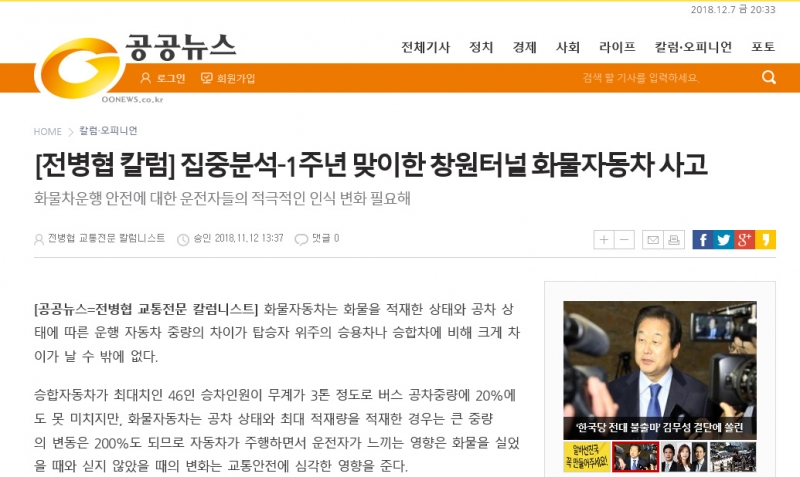 [전병협 칼럼] 집중분석- 1주년 맞이한 창원터널 화물자동차 사고/네이버 다음 2018.11.12