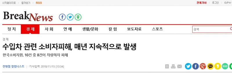 최근 5년 6개월간 총 1,410건 접수 한국소비자원(원장 이희숙)에 따르면 최근 5년 6개월간(2013.1.∼2018.6.) 수입차 관련 피해구제 신청은 총 1,410건 접수됐고 하며, 동일기간 국산차 관련 피해구제 신청은 총 2,945건 이라한다. 10건 중 8건이 차량하자 피해 피해유형별로는 ‘차량하자’가 81.4%(1,148건)로 대부분을 차지했고, 계약 불이행(불완전이행) 등 ‘계약 관련’ 피해는 18.6%(262건)였다. 차량하자의 구체적 내용(부위)을 보면, ‘엔진’이 25.2%(289건)로 가장 많았고, ‘차체 및 외관’ 24.4%(280건), ‘소음 및 진동’ 9.8%(112건), ‘변속기’ 9.0%(103건), ‘편의장치’ 8.5%(98건) 등이었다. 피해의 절반 이상이 출고 1년 이내에 발생 피해 발생 시기별로는 출고일 기준 ‘1년 이내’가 55.1%(778건)로 절반을 넘었고, 다음으로 ‘1년 초과∼2년 이하’가 10.6%(150건), ‘2년 초과∼3년 이하’가 9.2%(129건), ‘3년 초과∼5년 이하’가 6.5%(91건) 등이었다. 특히, 5.7%(80건)는 ‘계약 체결 중’에 발생한 것으로 나타났다. 한편, 피해구제 신청 1,410건 중 당사자 간 ‘합의’가 이루어진 경우는 51.5%(726건)였고, ‘미합의’ 34.3%(484건) 등이었다. 차량 상태 꼼꼼히 점검 후 인수, 수리 시에는 견적서와 명세서 교부받아야 한국소비자원은 수입차 관련 소비자피해 예방을 위해 ▲계약 전 사후서비스(A/S) 등 유지관리상 불편함이 없는지 확인 후 제작사와 차종을 선택하고 ▲계약 체결 시 프로모션 내용, 차량 연식, 인도 시기 등을 계약서에 명시하며 ▲차량 내외부, 하체 및 엔진룸 등을 점검 후 등록하고 ▲보증서(특약사항 명시)와 취급설명서의 내용을 충분히 숙지하고 ▲수리 시에는 점검·정비 견적서와 명세서를 교부받아 관련 분쟁에 대비할 것 등을 당부했다. |